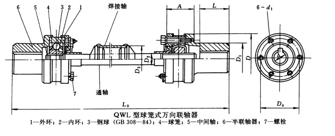 QWL型球籠式萬向聯(lián)軸器 特點(diǎn):1、傳遞公稱扭矩180-10000N.m 2、回轉(zhuǎn)直徑85-275mm 3、軸線夾角14-18度 詳細(xì)參數(shù)表